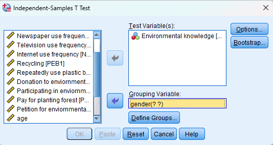 Independent t-test is also called two sample t-test. It is aimed at comparing the means of two groups. For example, I want to compare whether the average mean of environmental knowledge is the same between males and females. Academically, we often propose alternative hypothesis like “environmental knowledge is different between males and females.” While statistically, the null hypothesis we will test is “the average environmental knowledge is the same between males and females.”
