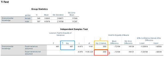 Anyway, according to the 2nd p-value, we can conclude that the environmental knowledge of females is statistically significantly different from males (p<.001). You can look for journals in specific fields to see the common reporting styles and what statistics should be reported.