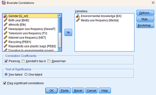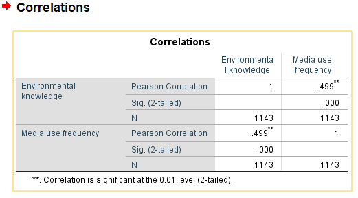 Interpretation: Environmental knowledge is significantly positively correlated with media use frequency (). Or media use frequency is significantly positively correlated with environmental knowledge (