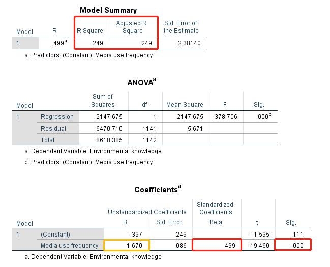 - Use environmental knowledge as dependent variable and media use frequency as independent variable.
