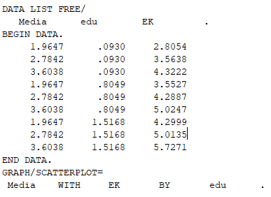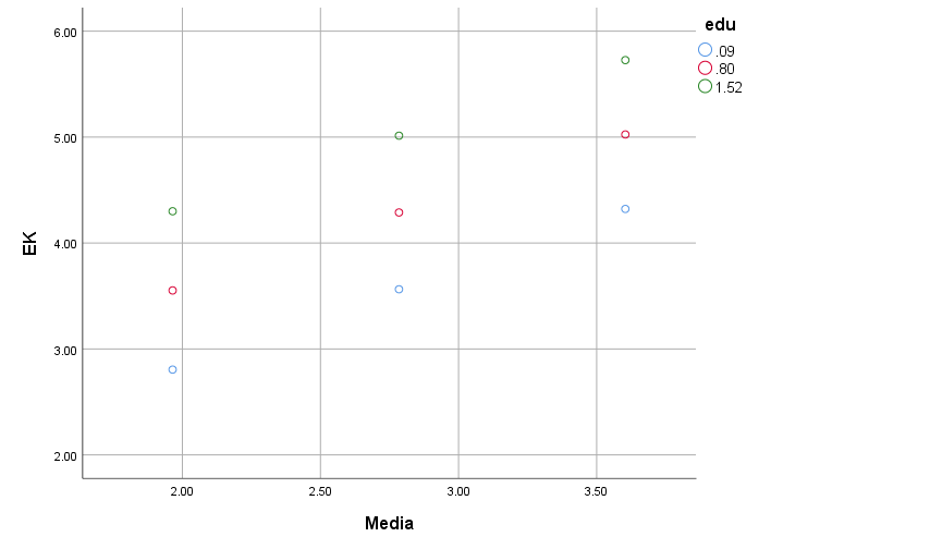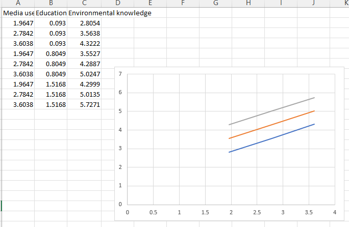 Actually it’s quite easy…The first column is the media use points, the second is the education, and the third is the environmental knowledge. You can see from the SPSS plot that, basically the interaction plot is plotted with 9 points. It can be plotted with excel “scatter plot(散点图)” add the numbers. Then it’s the art of Excel….
