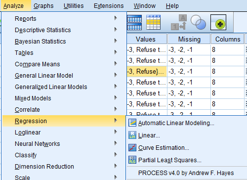 If you have successfully installed PROCESS Macro in your SPSS…Open it through Analyze -> Regression -> PROCESS.