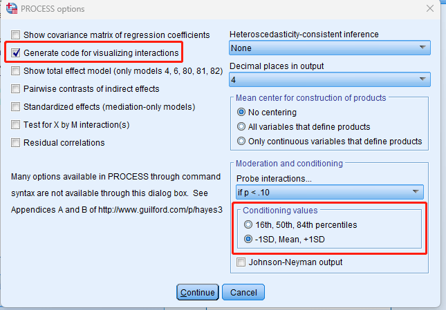 To judge whether there is interaction/moderation effect or not, just refer to the p-value of the interaction term. If you are going to calculate it manually, you can mean center them first and calculated the interaction term and then treat the interaction term as one independent variable and do the OLS regression like my previous post. But for convenience, I’m going to illustrate how to do and plot this with PROCESS Macro Model 1.