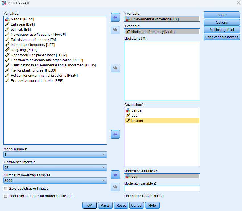 Recall the Model 1. W is the moderator, X is the independent variable, and Y is the dependent variable. So here I’m going to choose edu as the moderator, X is media and Y is environmental knowledge.